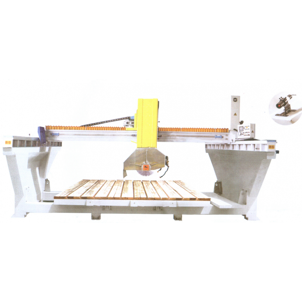Окантовочний мостовий верстат PLC 400-600 Моноблок застосуються для розкрою слябів з натурального каменю граніт, мармур та інших видів, а також штучного каменю. Дана модель оснащена автоматичним регулюванням положення зміщення балки і цифровим програмним управлінням. Його конструктивні особливості такі як, система лазерного наведення, магнітна лінійка, плавну зміну швидкості подачі диска, жорсткість конструкції верстата забезпечують високу точність різу і підвищену продуктивність. Вартість верстата включає в себе нахил диска для різання (в ручну через редуктор) 45 градусів до поверхні столу. У стандартній комплектації поставляється без голови, але з обертанням столу. Змонтований верстат на моноблок, не потребує залізобетонної конструкції і дозволяє при необхідності швидко і без зайвих витрат переставити верстат в будь-яке розташування цеху.